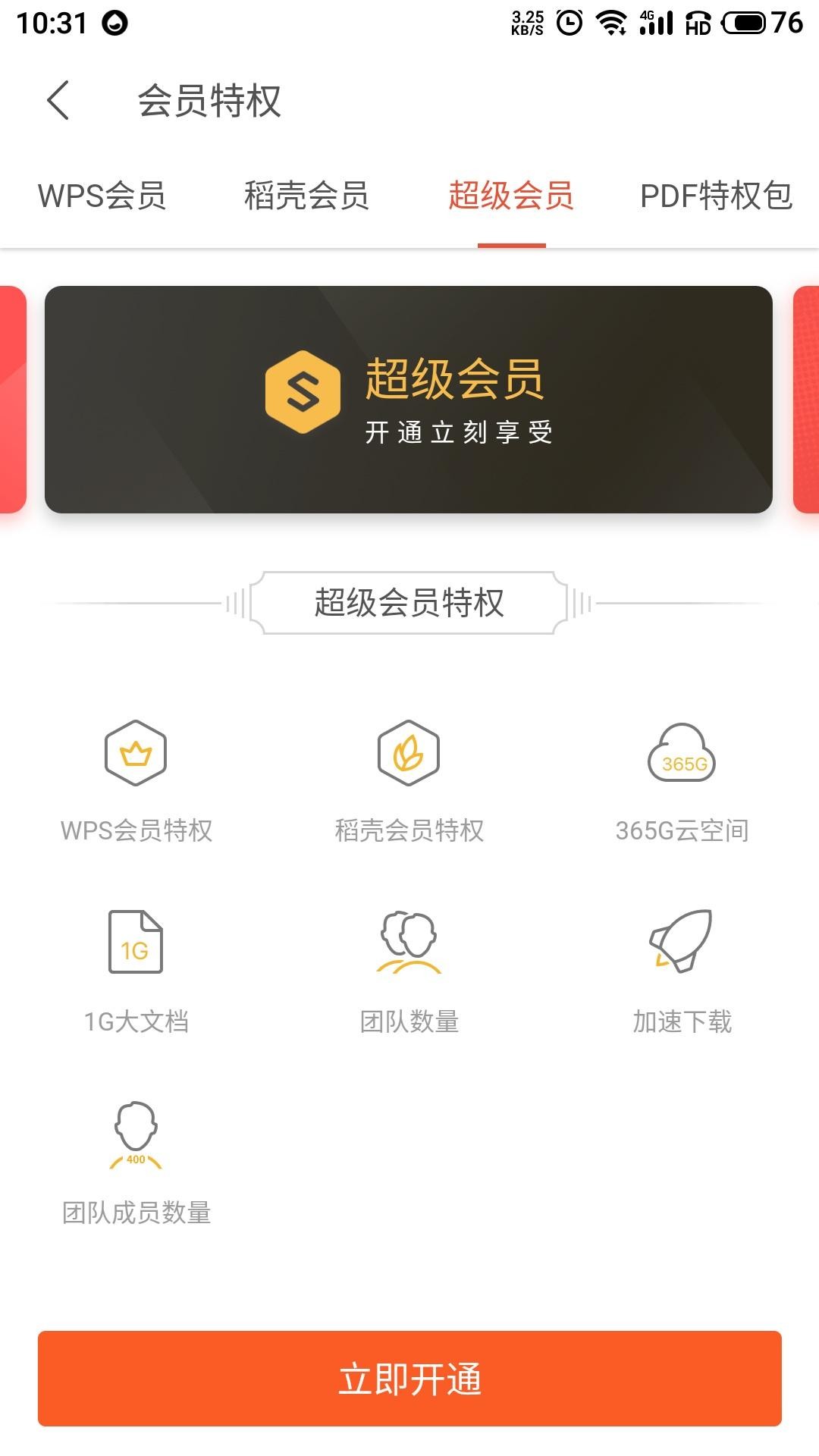 最后一种是超级会员,它所包含的特权非常多,比如有356G云空间, 1G大文档,文档加速下载,在线协同合作等。