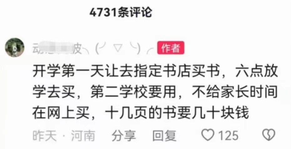 据家长反映,所指定的这本书只有十几页,却售价几十元。与此同时,老师并没有给予家长们足够的时间去网上购买这本书,令人感到不解和困惑。家长们怀疑这背后可能隐藏着一些利益输送或者其他不当行为,因此纷纷向有关部门举报此事。