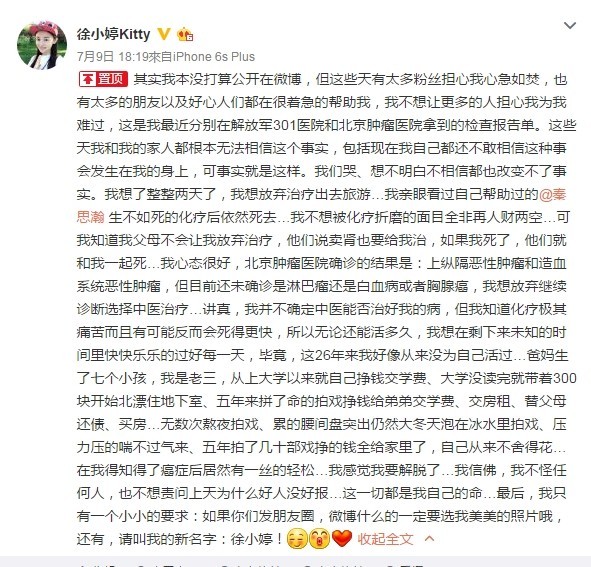 徐小婷确诊癌症「松一口气」离世前2个月微博留遗言