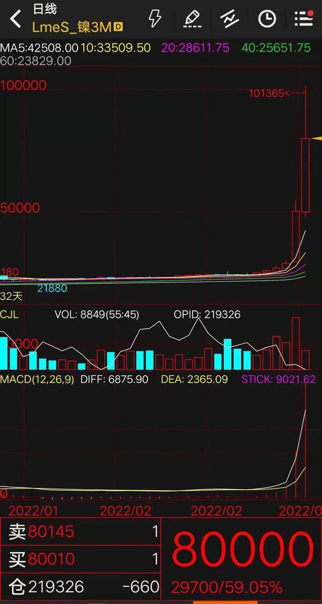 这一手被嘉能可(一个国际巨头)摸得透透的,嘉能可随即发动“逼空战”,“镍”逼空大战的主角伦敦镍期货价格,使得“镍”的合约价格一路飙升,在2天内从2.8万美元飙到10万美元,3月7日飙涨89%,3月8日继续跳涨超100%,两个交易日大涨超250%!最高涨到10万美元/吨,“镍”疯了!