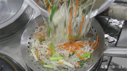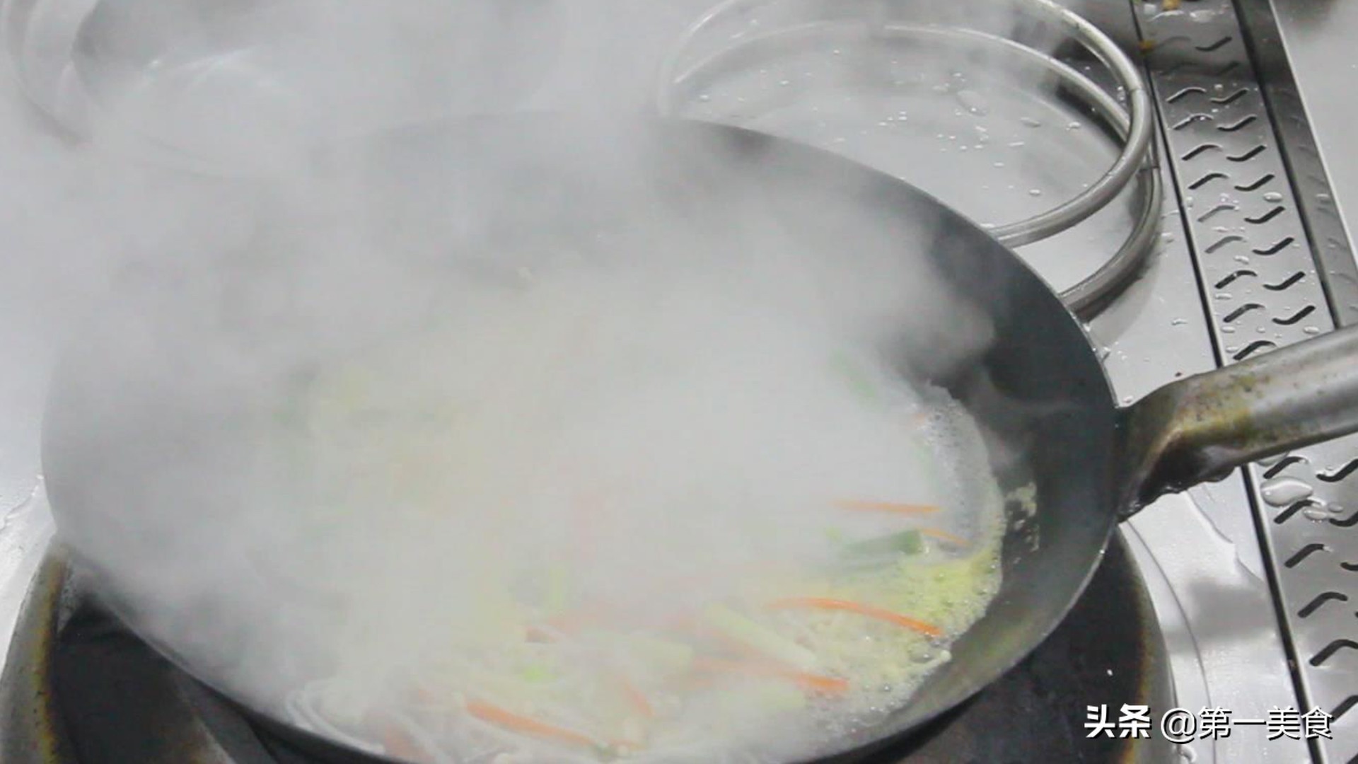 锅中烧开水,水开之后,倒入准备好的金针菇,胡萝卜丝,蒜苗,焯水1分钟即可捞出。