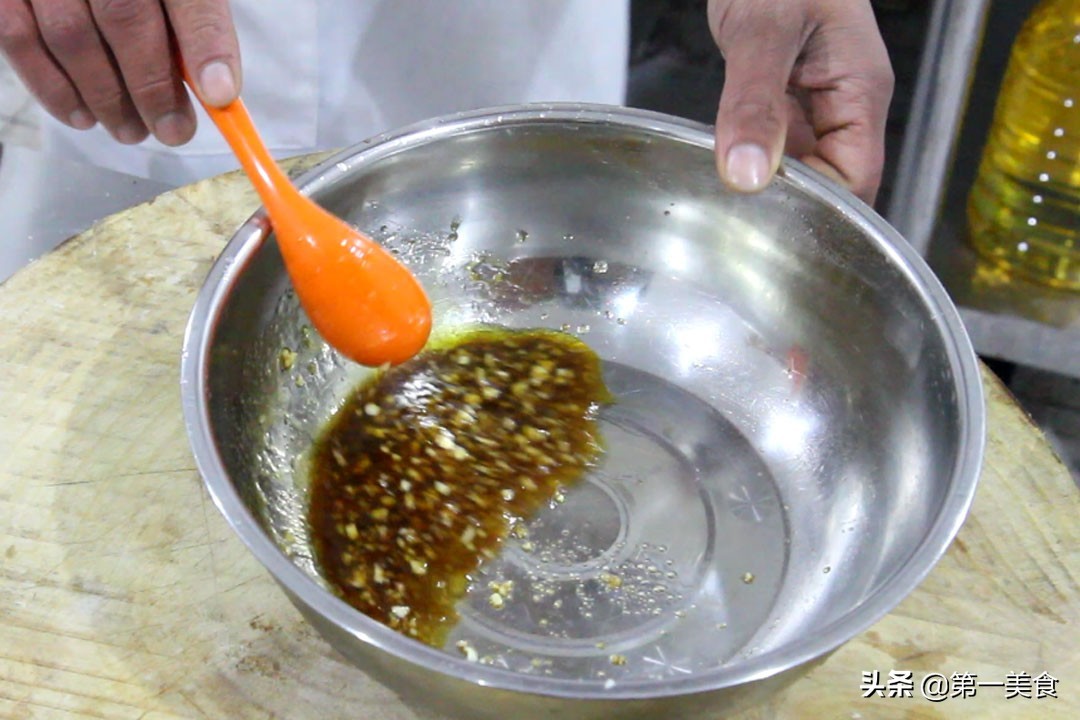 准备一个盆,盆中倒入蒜末、食盐、味精、白糖、生抽、陈醋、芝麻油,最后加一勺开水搅拌均匀,充分地化开调料。