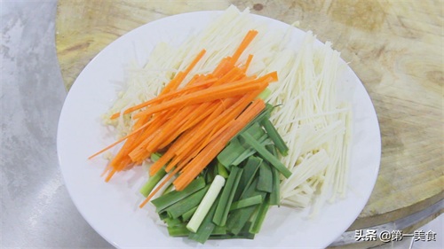 蒜苗3—5根,切成4厘米左右的段,胡萝卜半个,切成细丝。
