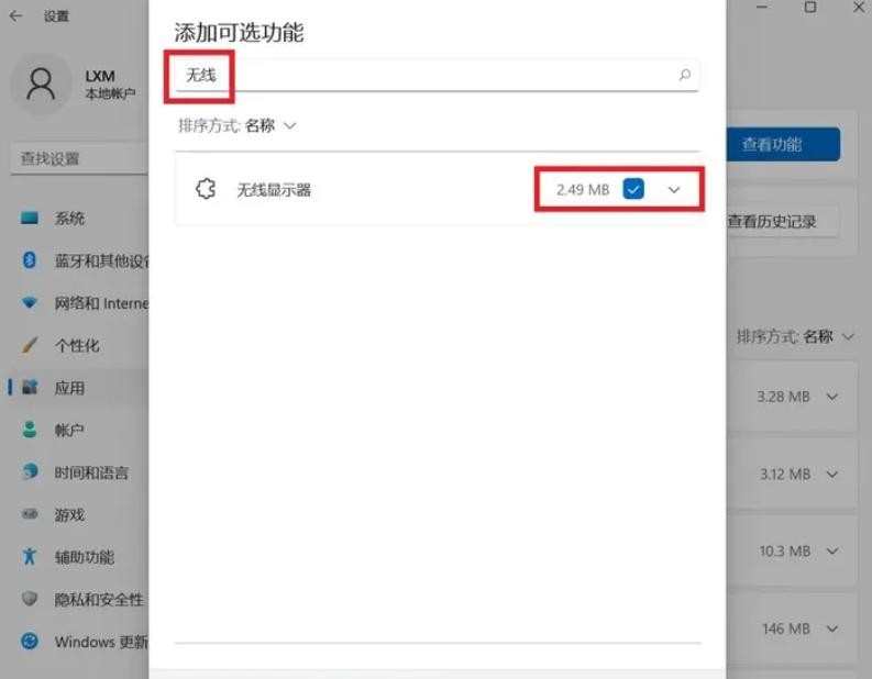 4.在搜索框中输入“无线”,找到“无线显示器”勾选并下载。