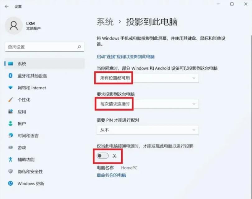 6.随后再次回到“投影到此电脑”界面,按照下图中的设置进行调节。