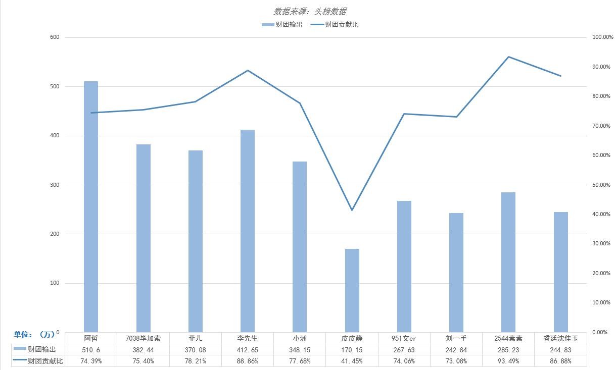 比较财团输出贡献,可以看到女主播中财团支持最高的是排行第九名的素素,她在本月收入占比中超过九成来自于土豪大哥贡献输出,也是榜单中财团贡献占比最高的主播。男主播中财团支持最高的是李先生,贡献比高达88%,但财团输出金额最高的主播还是第一名的阿哲。