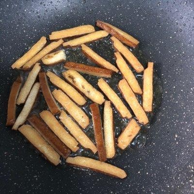 1、猪肉冷水下锅放料酒、生姜煮熟后捞出来等凉了切片,豆干切片。
