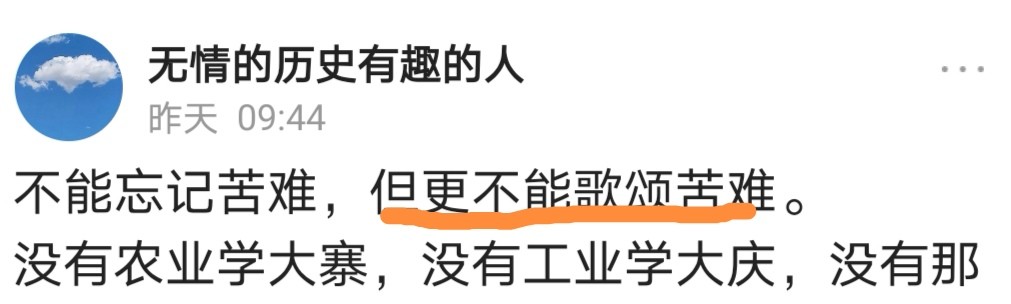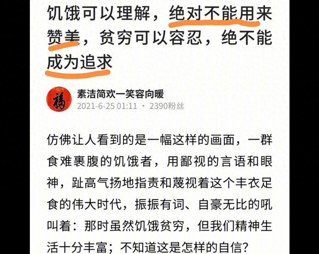 也有人为了反对这些文章的描述,虚拟论点,然后搜罗论据,予以论述。虚拟的论点如图标示,毫无常识可言,根本就经不起推敲。试问,谁会脑残到赞美饥饿、追求贫穷、歌颂苦难?能以此为论点,也真是令人大开眼界了。岂不知自吹自怜,洋洋得意,下笔千言,离题万里;关公战秦琼—摸不着边,赵匡胤拿偃月刀—胡侃。说到高潮,露出了狐狸尾巴:怀念过去,就是倒退,就是破坏改…开。一顶帽子甩出来,只是为了反对而反对。
