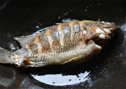 第2步:开火热锅,等锅热好之后就可以倒入适量的植物油,油热好之后就可以放两勺盐铺在锅底,这可是十分重要的一步,这可是是能保持鱼皮不被煎破的秘诀,然后再把之前准备好的鱼倒进去,这一步就是煎鱼,把鱼下锅之后就是将鱼煎到金黄的颜色就好了,一定要两面都是呈金黄的颜色,只要把鱼皮煎成微焦的状态就可以将它铲出。