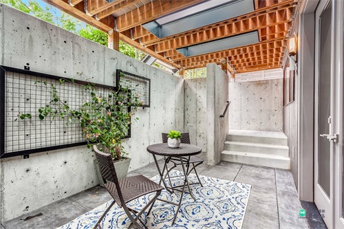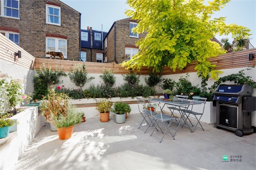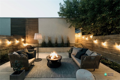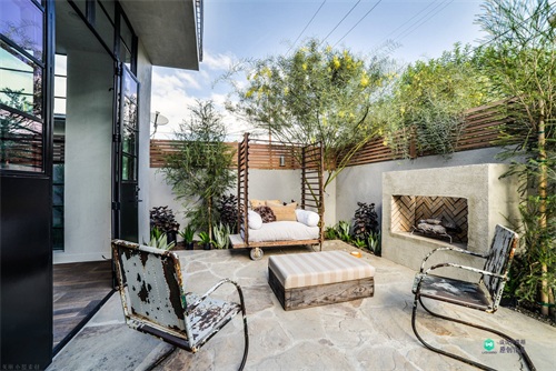 原本的混凝土围墙会显示比较单一,通过用防腐木增加围栏高度,一方面保证了私密性,另一方面让院子多了一丝温馨。院子的地面采用米白色不同形状的碎石铺装,与围墙搭配起来,让院子看起来干净又大方。院子周围种植了不同的植物装点,中间的壁炉可以让人们在院子聊天的时候多一些温暖,两把生锈的椅子增加艺术感,白色可以移动的沙发带来的趣味性。生活在这样的院子里,一定会很舒服,每天只想赖在院子里。