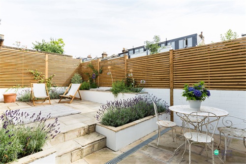 简约风的小院子好静谧,这个院子利用高低分出两个区域,平台上面的休息区域,加高的平台正好把白色的围墙遮挡住,周围只留下防腐木制作成的围栏,白色与暖木色搭配起来,简直就是绝配。下面的用餐区,采用了两种材料的制作围墙,一组的白色铁艺餐座椅,让院子中增添了清新浪漫的氛围,与长满薰衣草的白色花坛互相搭配。