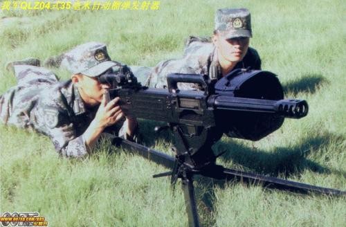 QLZ87式35毫米自动榴弹发射器,是一种既能直射,又能曲射,集杀伤与破甲于一体的步兵自动武器。配备6发或15发弹鼓供弹,可使用DFS87式杀伤弹、DFJ87式破甲杀伤弹、DFR87式燃烧弹、DFN87式杀伤燃烧弹以及DFD87式烟雾标示弹等弹种。射速可达每分钟45发。榴弹直径为35mm、全弹重250g、杀伤半径大(宣称为11m)、破甲深度达80mm。可安装于各型车辆与直升飞机上使用。除对地面目标外,尚可攻击低飞空中目标。