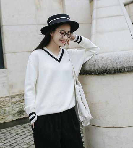 1.学院风V领毛衣。