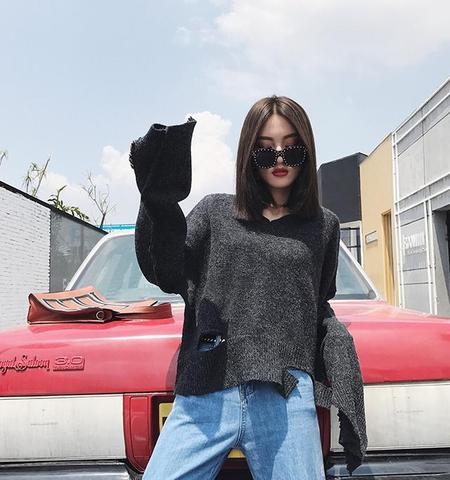 在领口或者下摆做镂空或者故意撕破效果,增加了毛衣的不对称性,是一种很有设计感的毛衣。