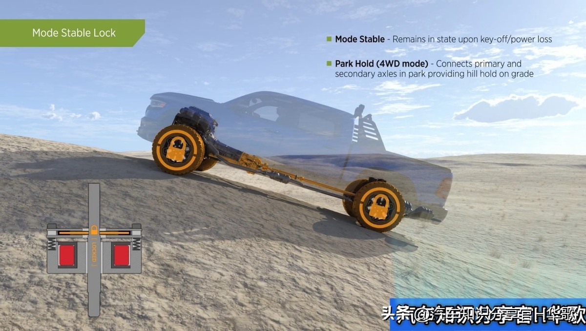 TOD+Mlock适时四驱+机械锁止, 简单来说就是在TOD适时四驱系统上增加一个滑套式机械锁止机构(Mlock),在重度越野时成为硬机械连接形式,也就是说的中央机械差速锁,扭矩容量达到了1900Nm。