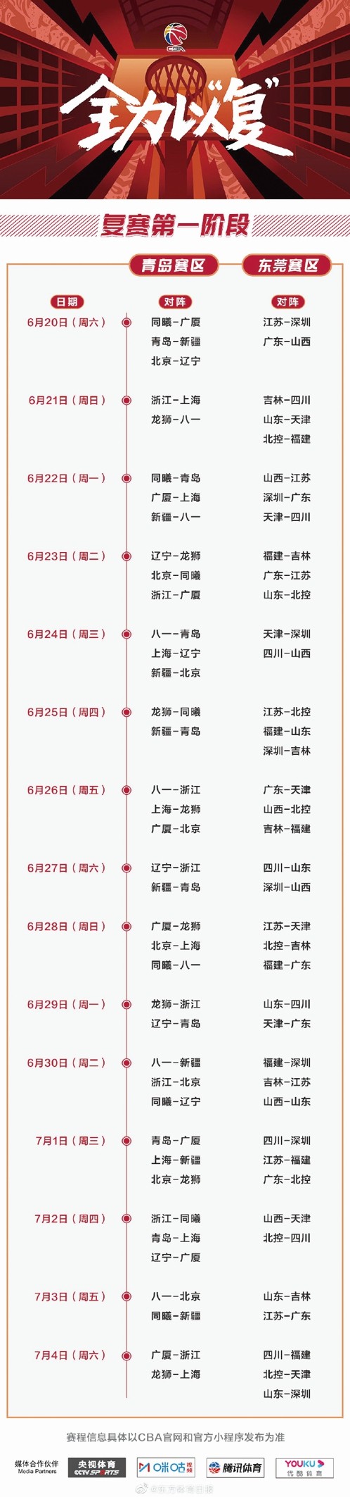 结束了超过132天的等待,CBA联赛终于迎来复赛消息。中国篮球协会昨天下午在官方微博上发布公告:“经体育和卫生健康部门同意,CBA联赛将于6月20日复赛,各项筹备工作已经进入实质性阶段。比赛将会以赛会制方式,分别在山东青岛和广东东莞两个赛区展开。复赛期间,CBA联赛将严格按照相关预案,要求所有参赛球队和工作人员遵守国家和当地疫情防控要求,确保赛事安全有序进行。”