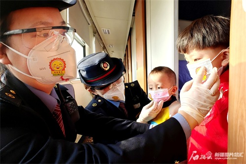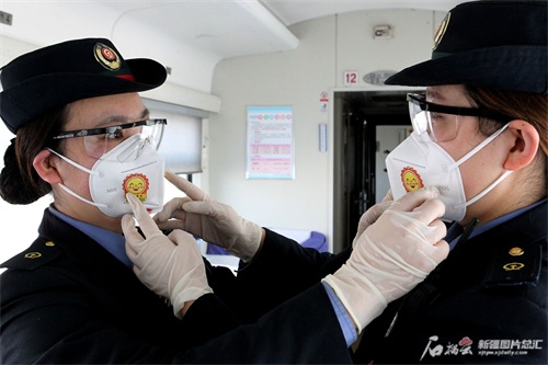 列车工作人员相互佩戴“微笑口罩”。石榴云/新疆日报讯记者 杨斌摄