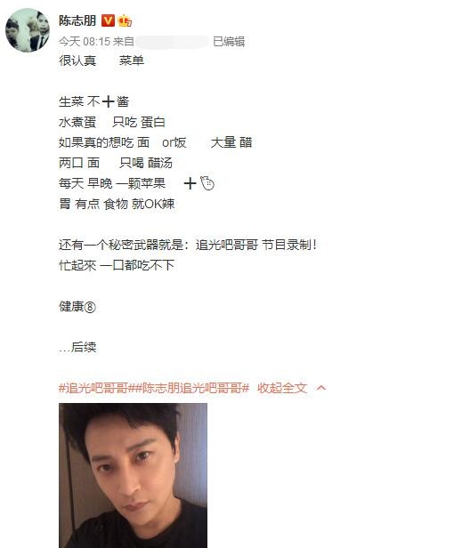 之前,陈志朋曾晒自己暴瘦20斤,而暴瘦的秘密就藏在公布的食谱里,每天早晚一只苹果,吃两口面,配醋汤,鸡蛋只吃蛋白,节食成这样,不瘦也不行了。