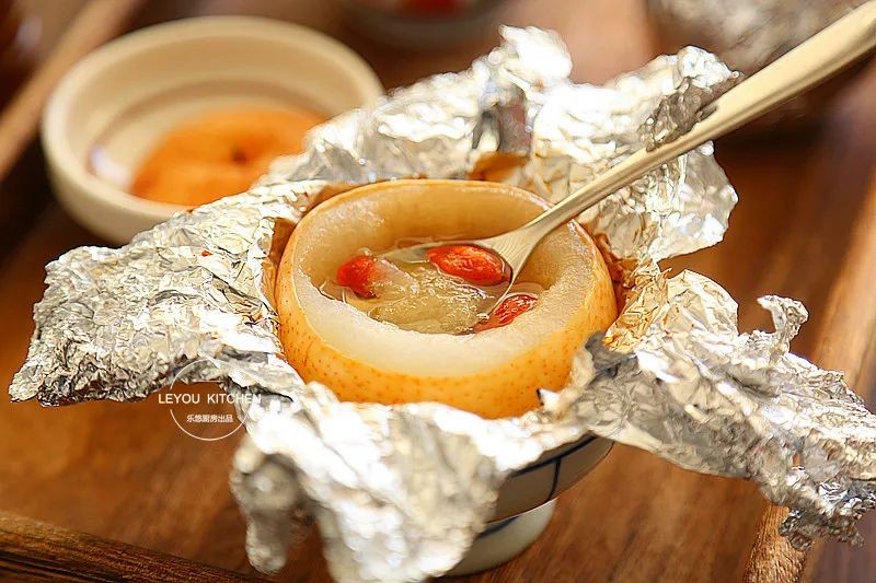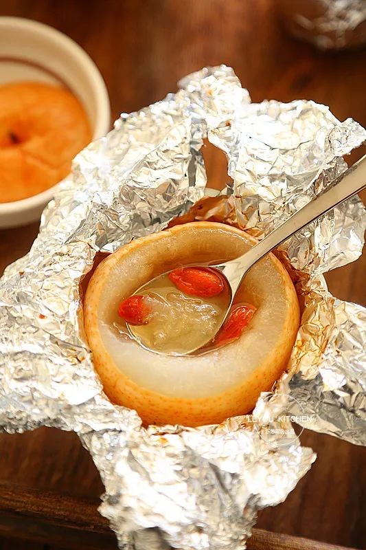 这个烤梨,做法超简单,不用开明火,把梨洗干净后挖掉核,放冰糖、枸杞,然后用锡纸包严实,放到烤箱或者空气炸锅中烤熟就可以了,也不用人看着,特别省事。