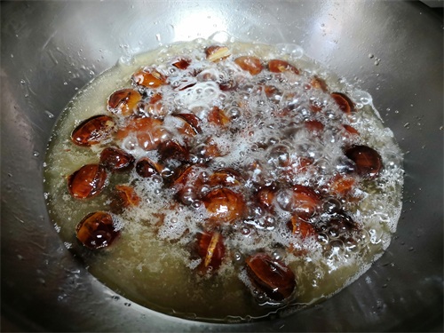4、这个过程要不断翻炒,防止糊锅,翻炒到板栗、油、糖融合在一起,并且均匀的裹在板栗上,然后倒入开水,水没过板栗即可。大火煮开,然后中火煮15分钟。