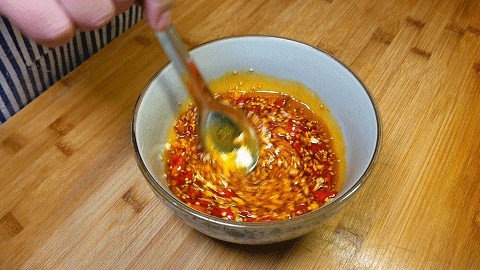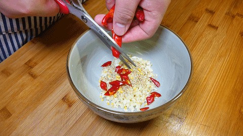 4.烧一些六成热的热油,把热油浇在红辣椒和蒜末上,用高油温激出香味。