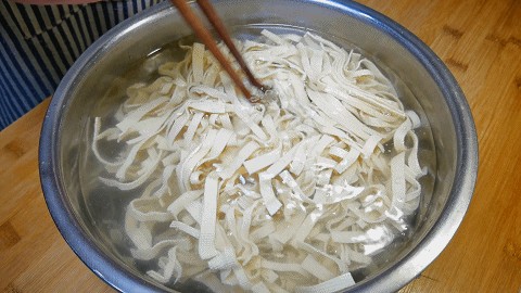 7.焯水完成控水捞到凉白开中,使豆皮迅速冷却,防止粘连在一起。