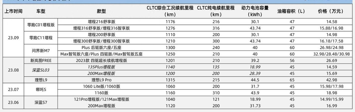 这个数据,从今年上市的全新增程式电动车数据就能够看得出来,纯电续航里程普遍更长。尤其是之前一直专注于纯电市场的零跑汽车和哪吒汽车,更是推出了纯电续航超过300km的增程式产品,这甚至比之前的一些纯电车续航里程还要长。