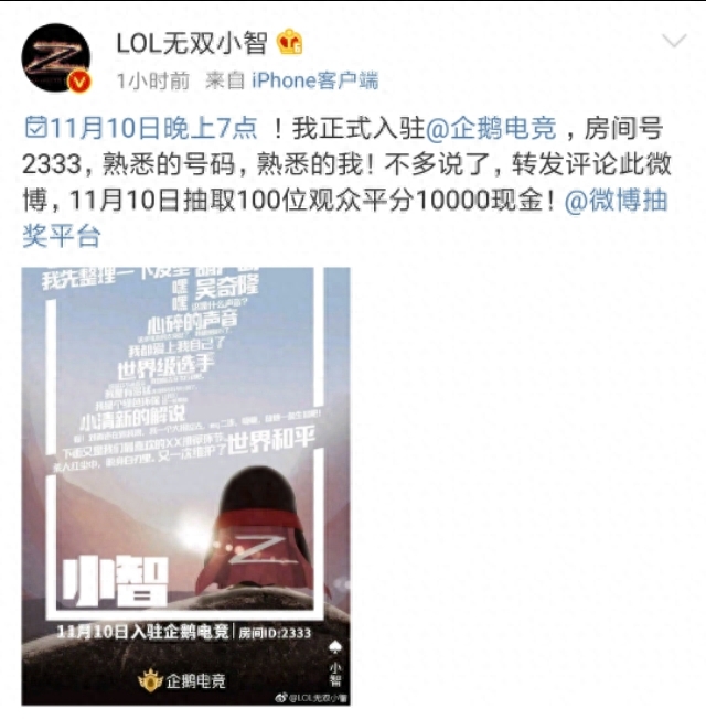 11月10日,小智将在企鹅电竞首播,各位请准备好粉丝牌,一起关注吧!